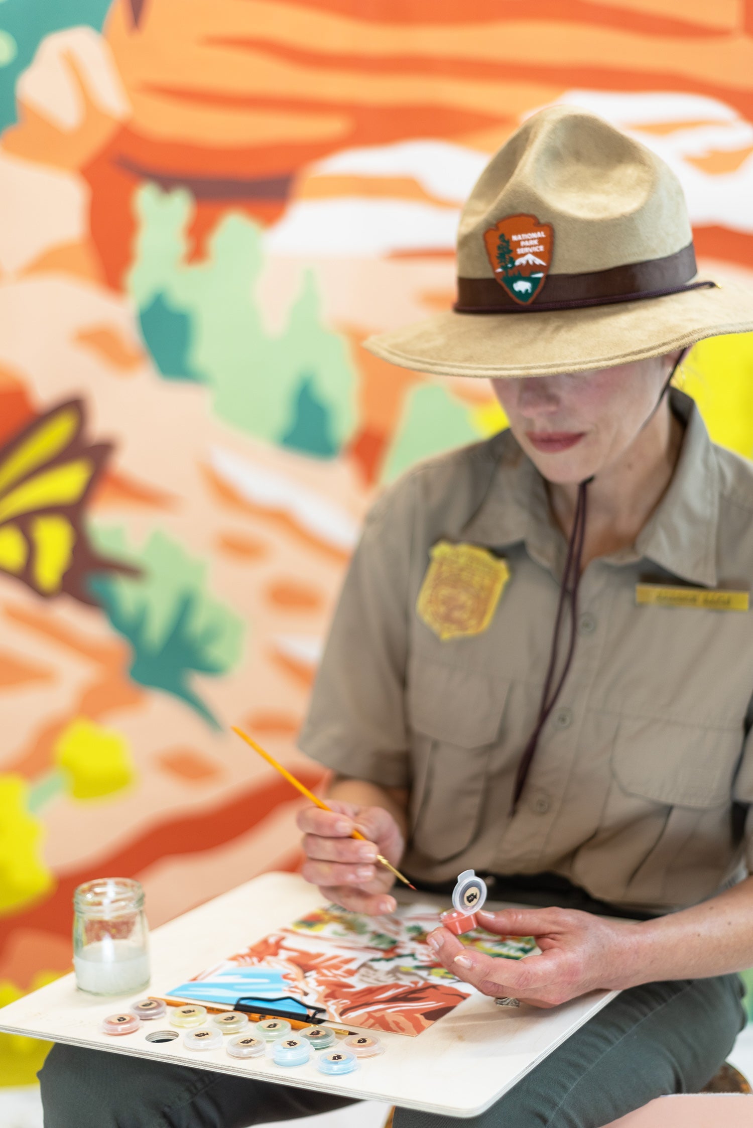 The Capitol Reef National Park paint-by-number kit showcases the magnificent Hickman Bridge—a natural formation spanning 133 feet, making it one of the largest rock spans in the park. The yellow flowers blooming among the landscape are Chamisa—also known as Rabbit Brush. Nestled in the brush is a butterfly sipping a bit of nectar.