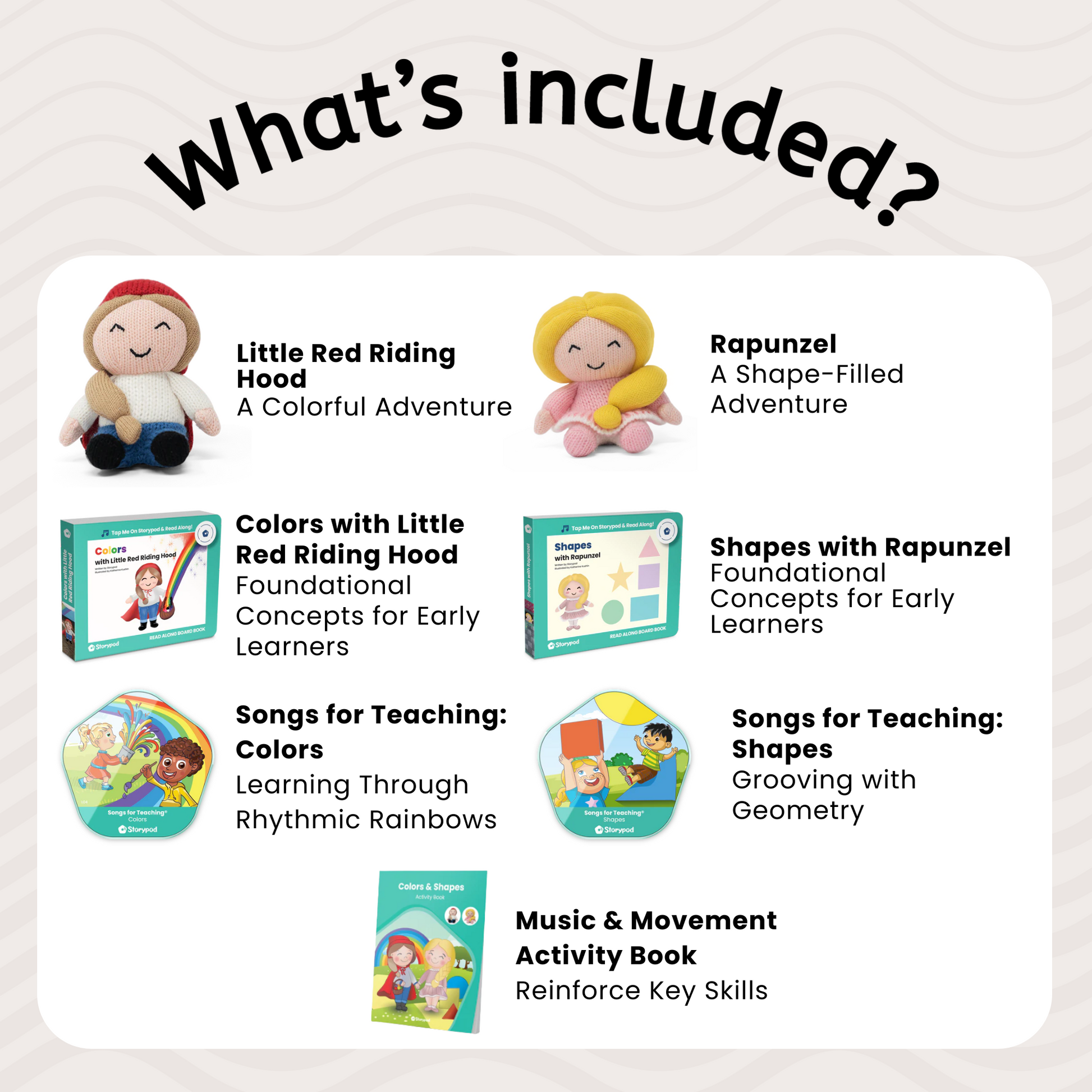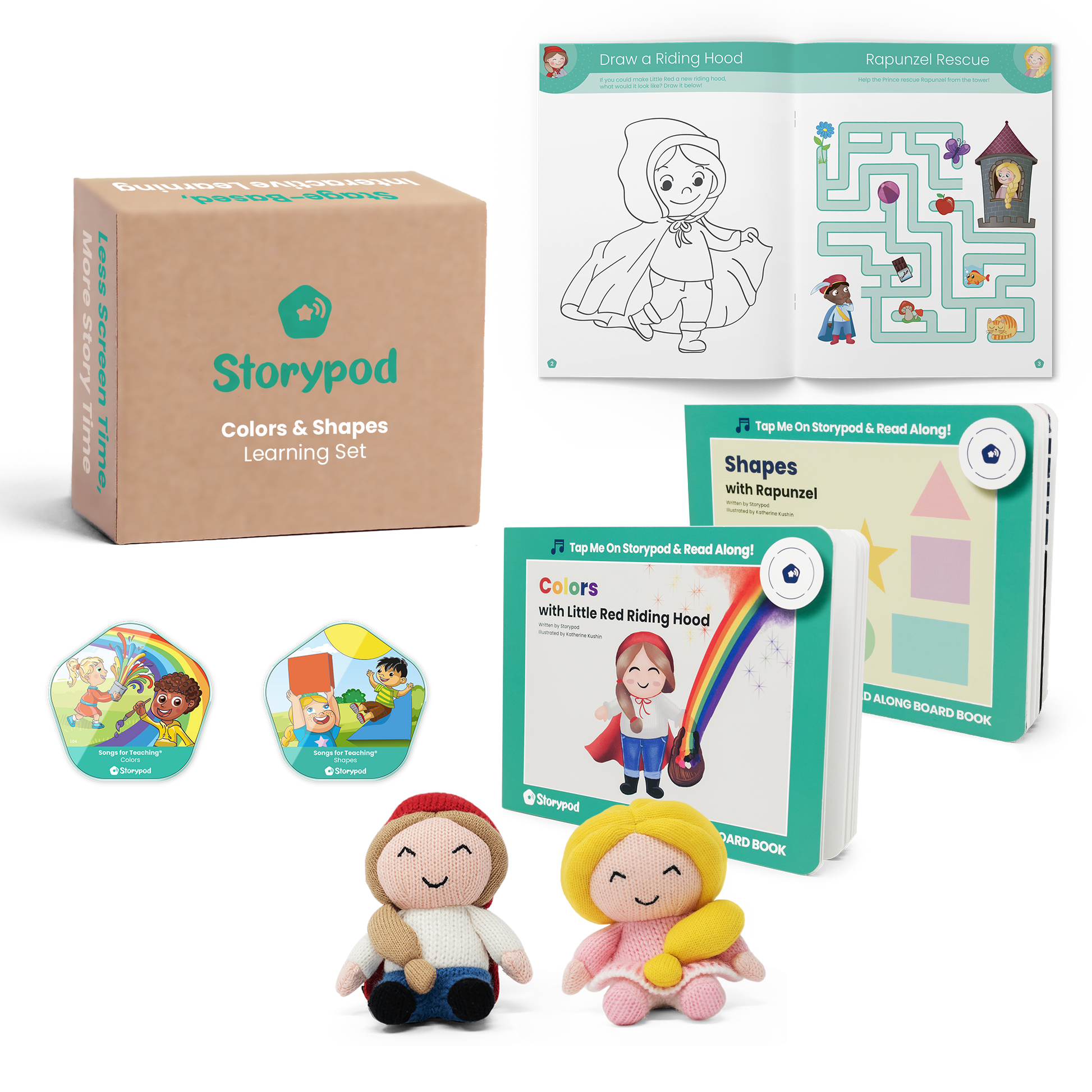 Dive into our "Colors & Shapes" Set, where fairy tales meet educational fun. Little Red Riding Hood and Rapunzel aren't just about the stories; they bring colors and shapes to life. "Little Red Riding Hood Colors" and "Shapes with Rapunzel" weave knowledge seamlessly into narrative. The "Songs for Teaching" series offers 20 minutes of catchy tunes, one dedicated to colors and the other to shapes. With the addition of the Activity Book and Conversation Starters, hands-on learning and discussions are encouraged.